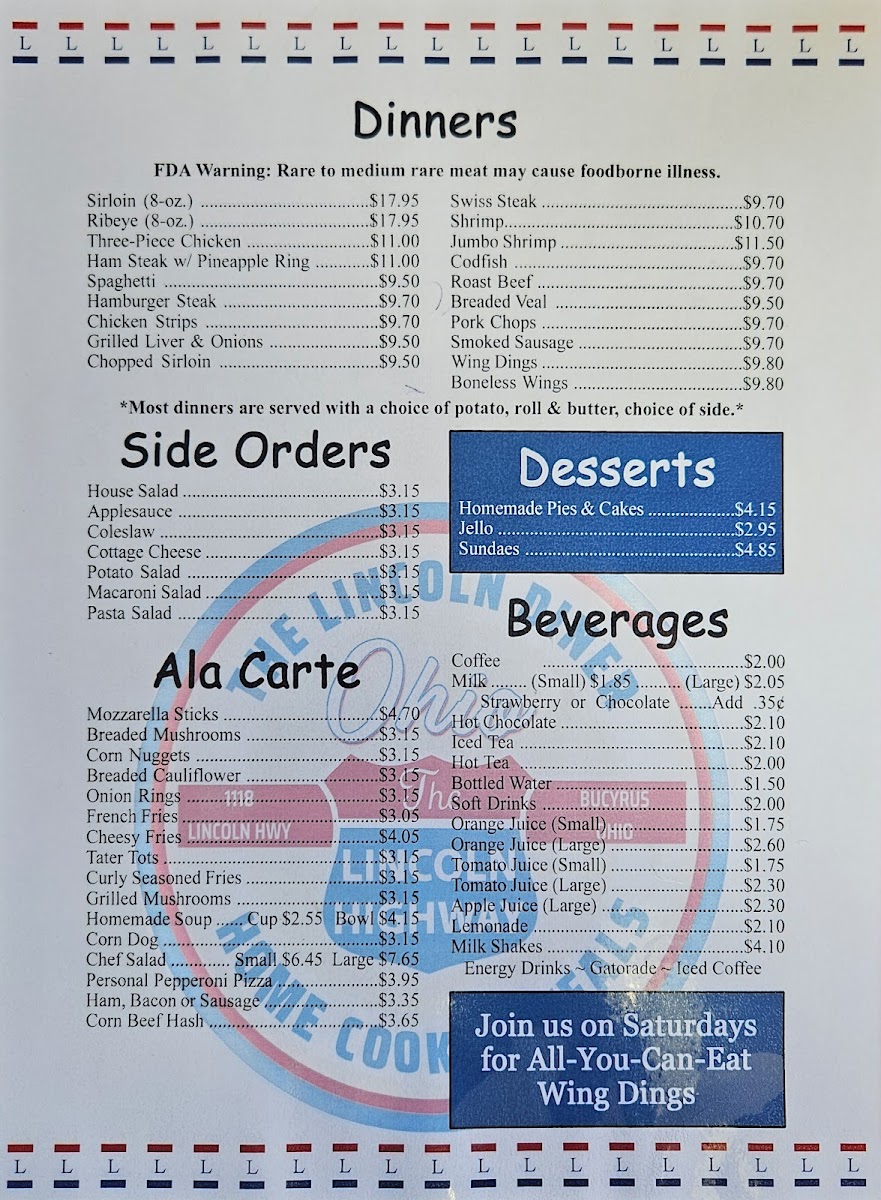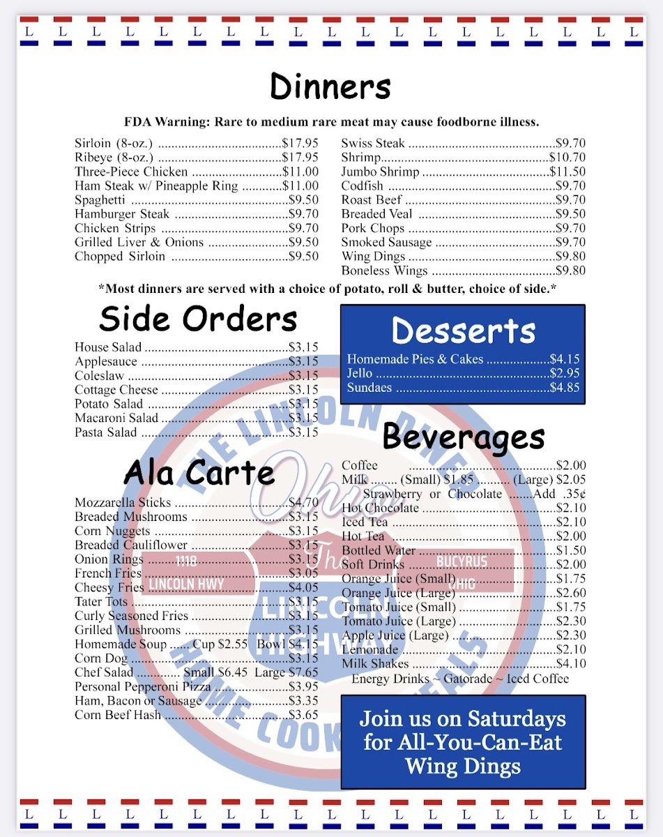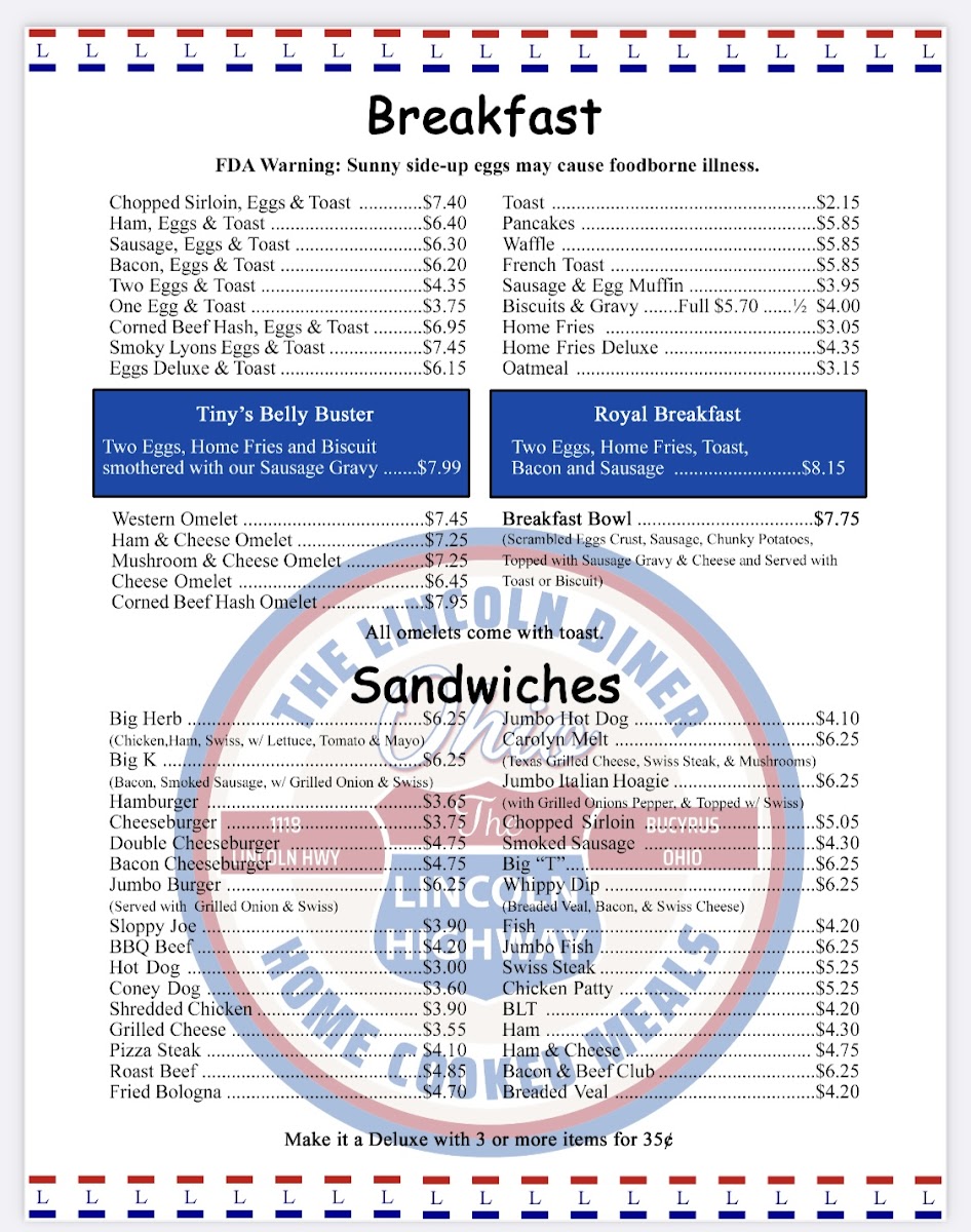 Welcome to The Lincoln Diner, a delightful culinary gem nestled in Bucyrus, OH. With its warm atmosphere and a menu that pays homage to classic diner fare, this spot promises a hearty meal for everyone. Start your day with the Barnyard Breakfast, featuring two eggs, crispy bacon, and a buttery biscuit smothered in sausage gravy—all for just $11.35. For lunch, try the Swiss Steak Sandwich topped with savory brown gravy and mushrooms, paired with crispy fries, a steal at $10.25.