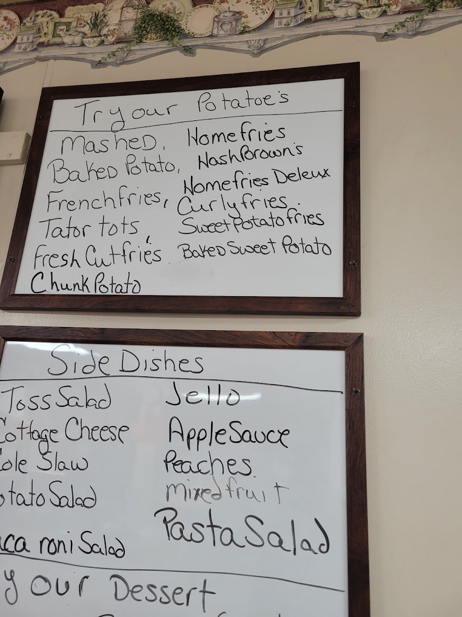 COUNTRY FRIED STEAK AND MASHED POTAOTES ALL COVERED WITH COUNTRY GRAVY CHOICE OF SIDE DISH DINNER ROLL